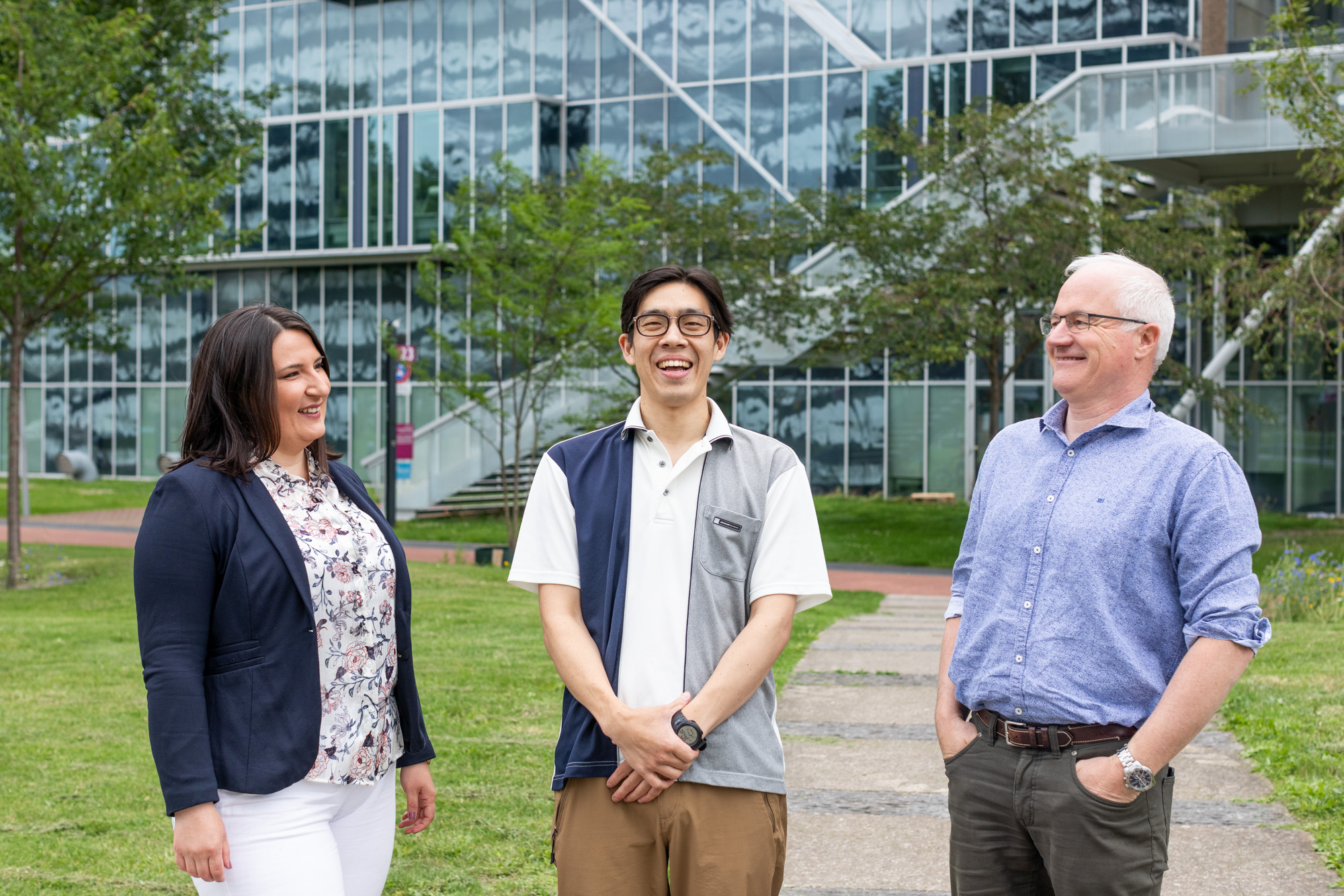 Assistant professor Jovana Jovanova (left), Yoshinari Nishiki (middle), and professor Lori Tavasszy (right), team SCT/July 2020@TU Delft [photo: Florian Braakman]